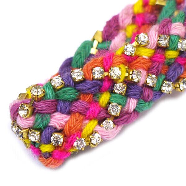 カラフルに糸を編んだブレスにキラキラとストーンが光り