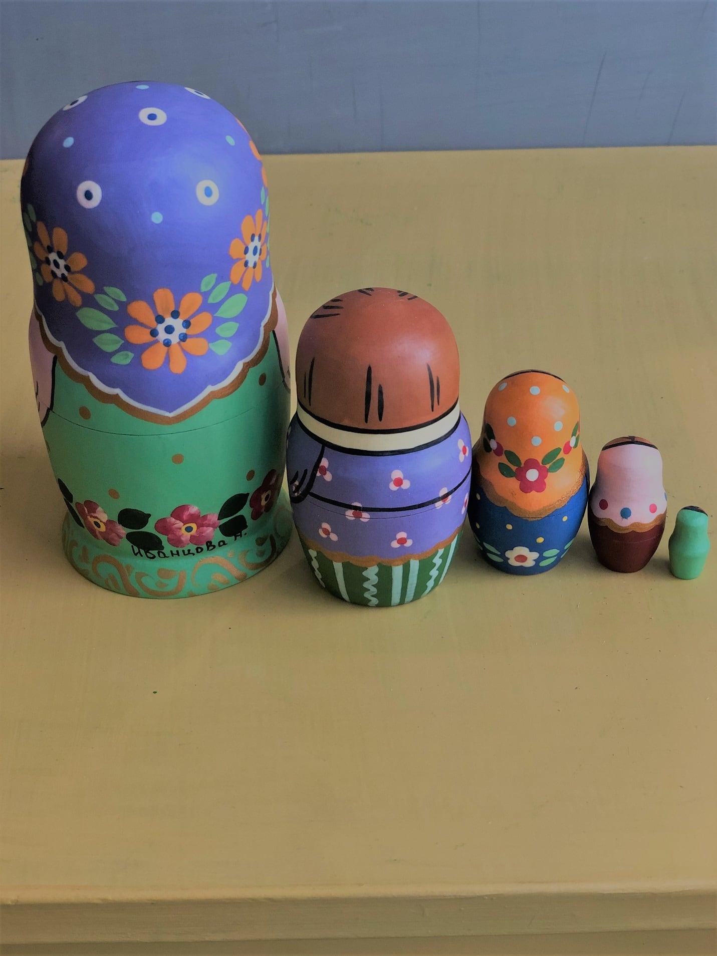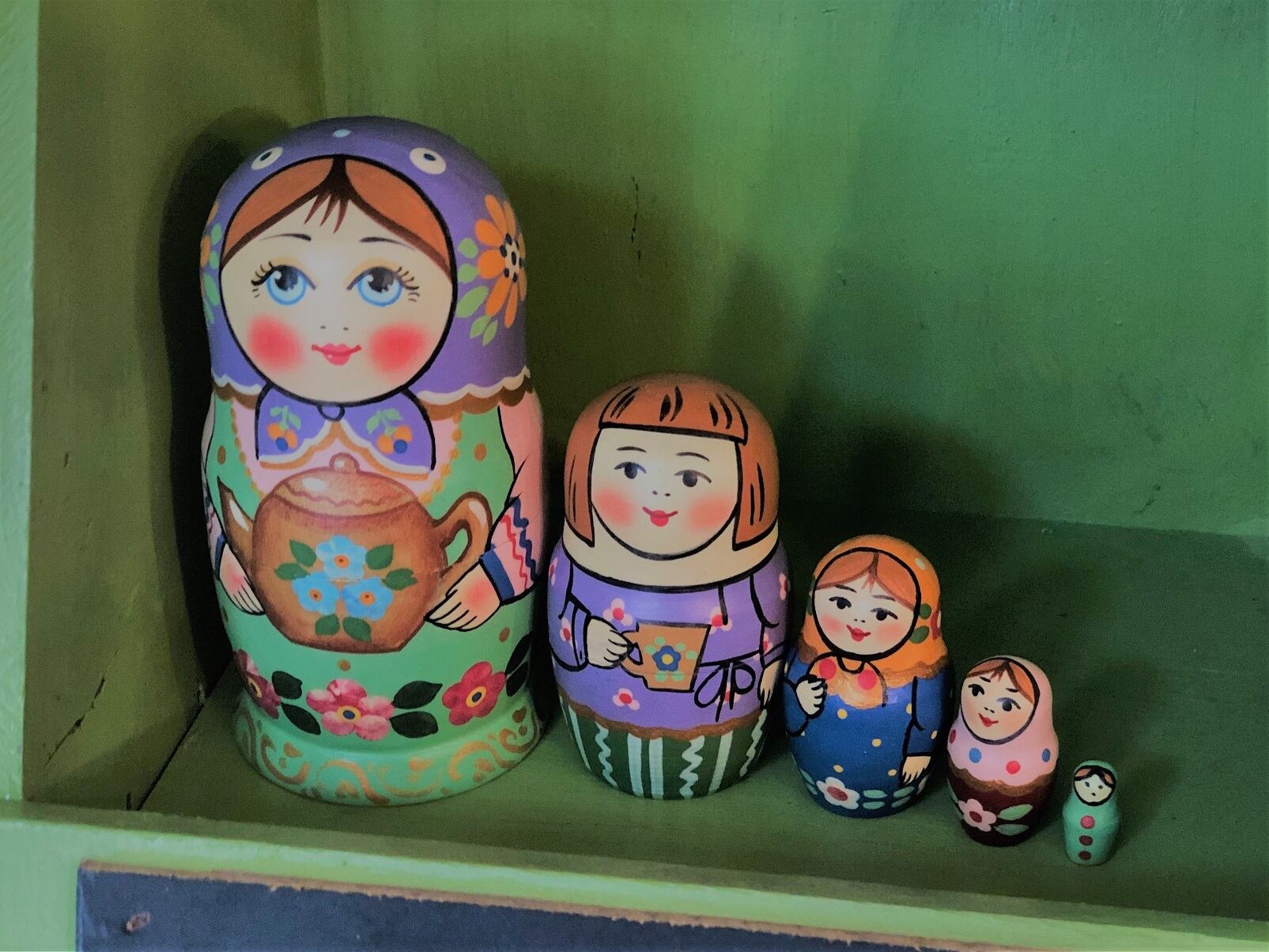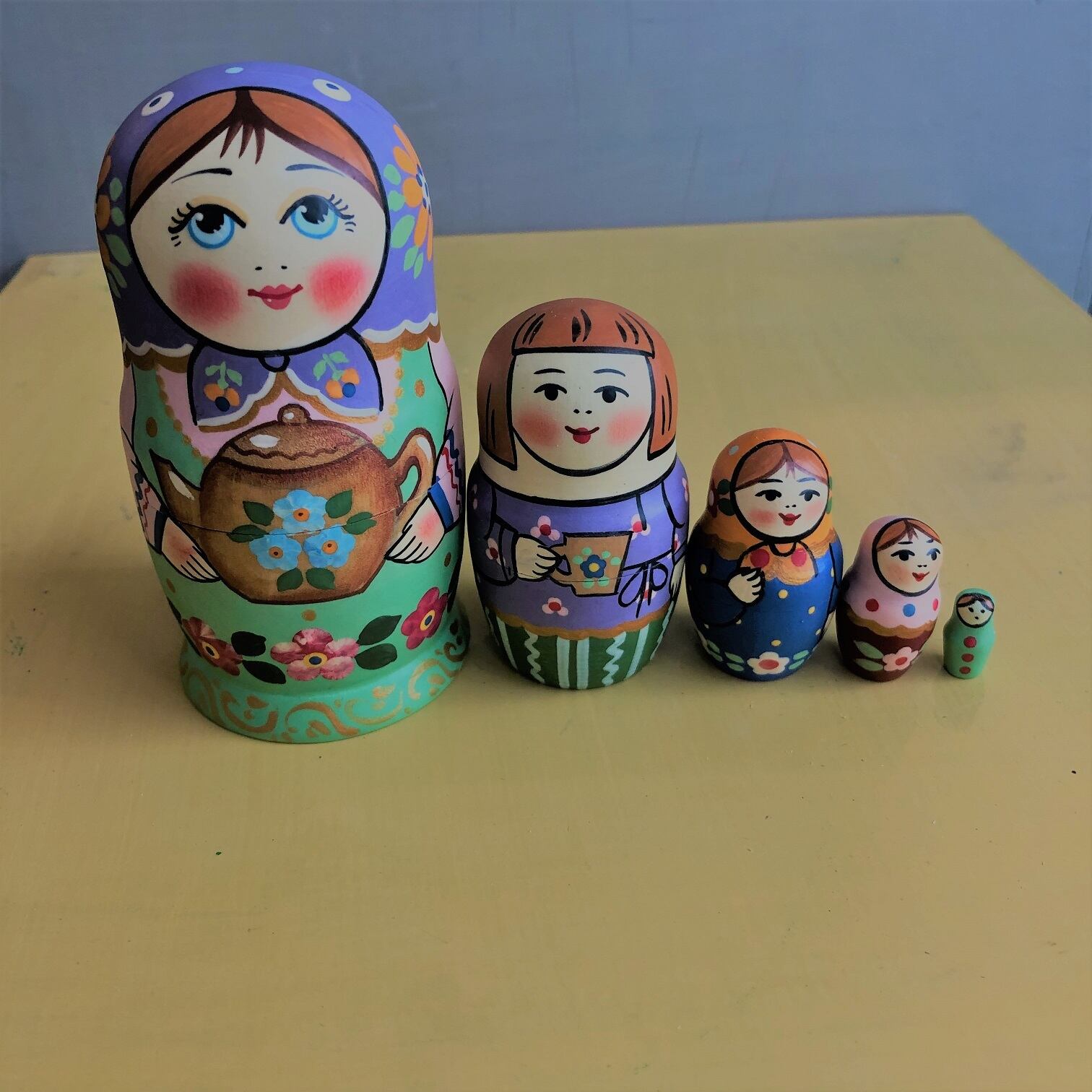 ロシア縁起物 マトリョーシカ発祥の町・セルギエフ・ポサード産 珍しい 『ティータイム』 5人組 M ロシア工房製 マトリョーシカ 1点もの 縁起物