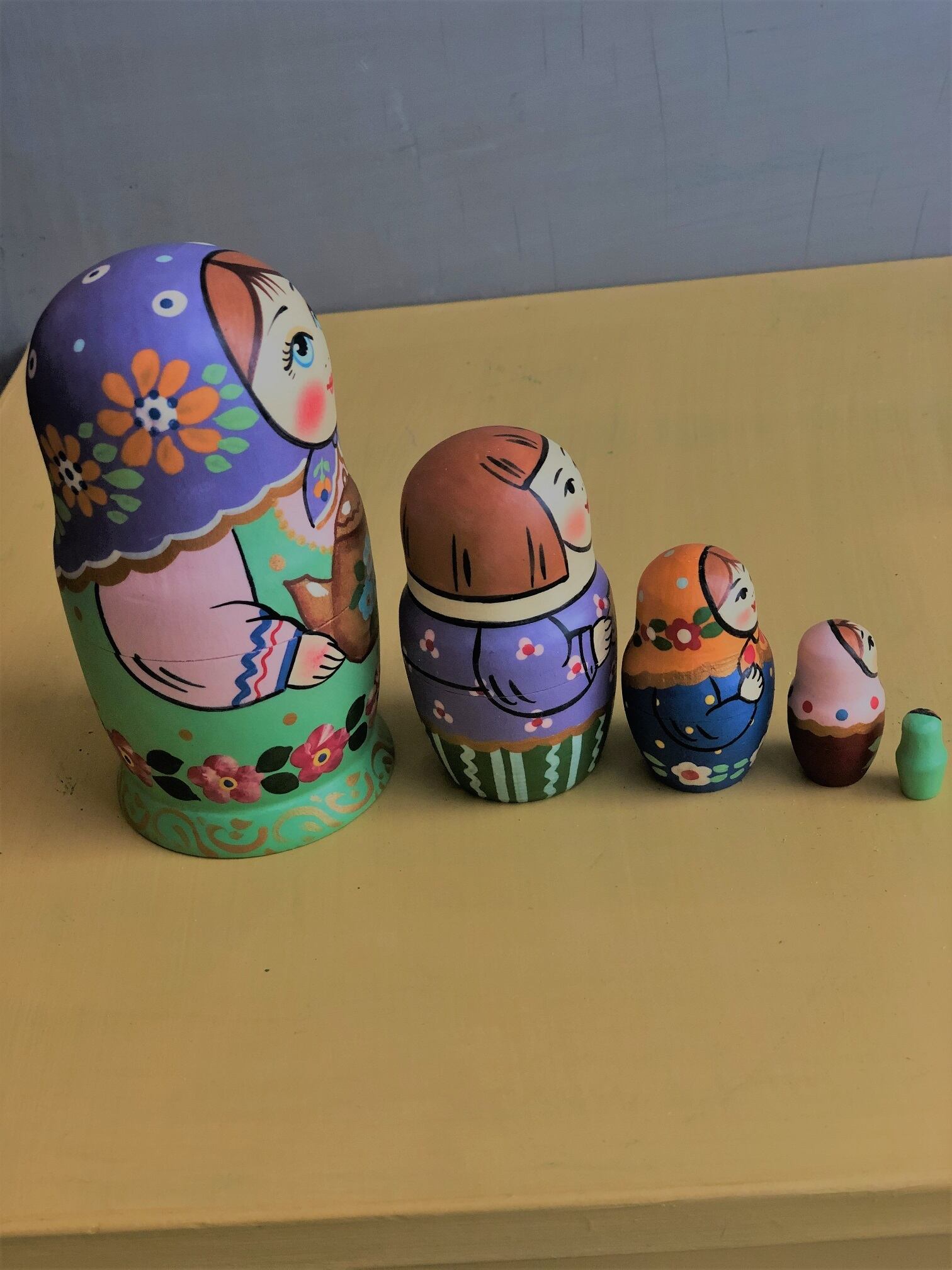 入れ子の中のそれぞれのピースが別々の衣装で..頭巾やエプロンの色が違っているのが特徴です!!