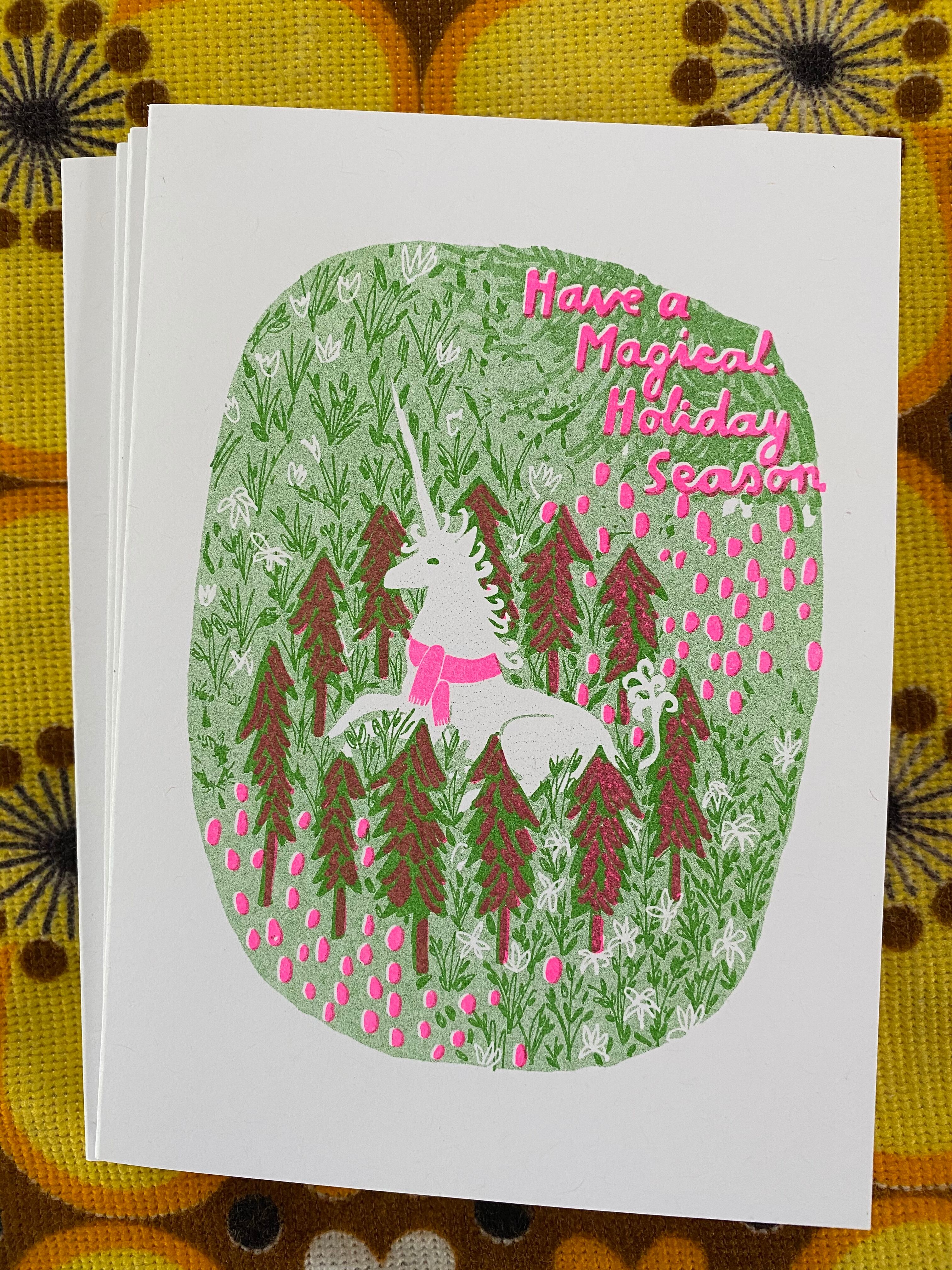 Yellow Owl Workshopの一角獣のグリーティングカード.
