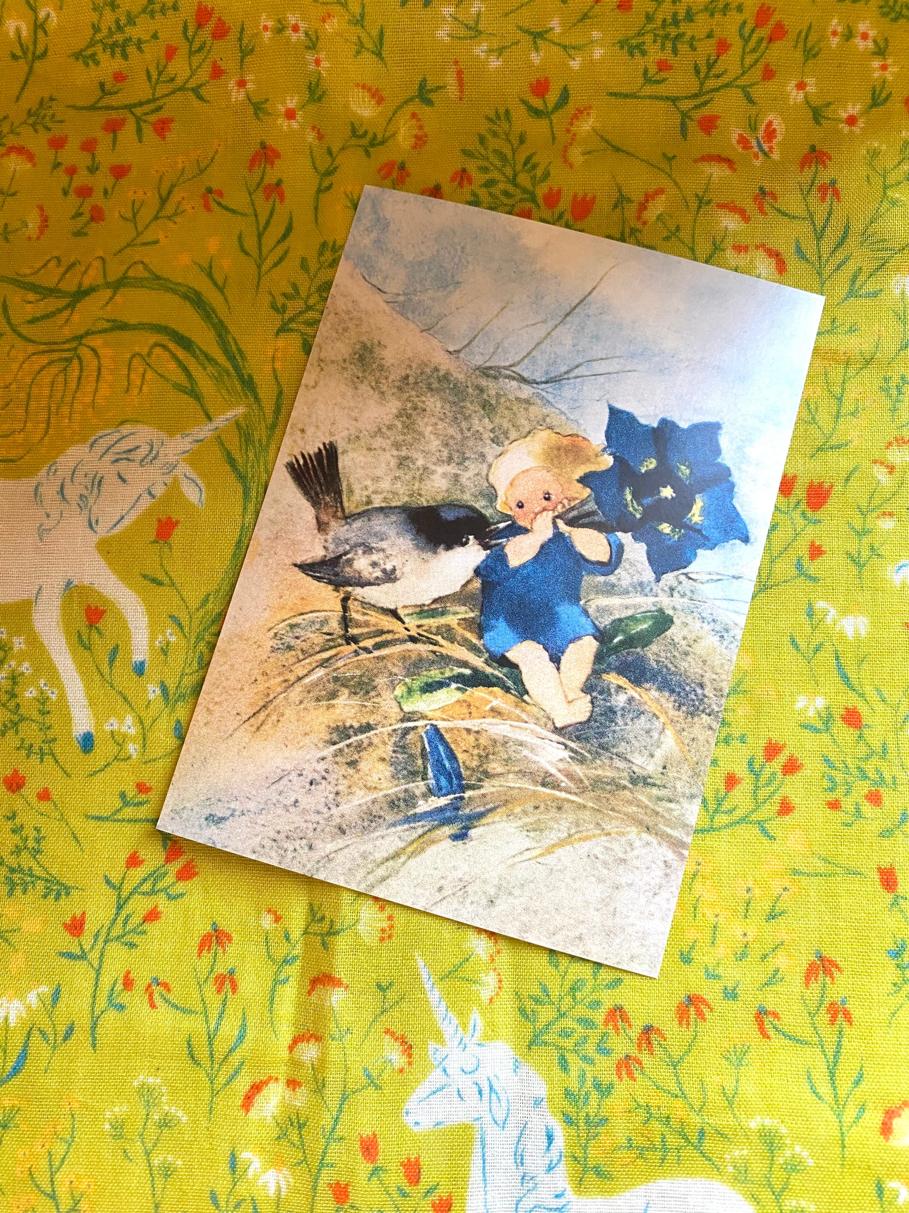 お花をラッパを奏でる子どもと小鳥のポストカード.