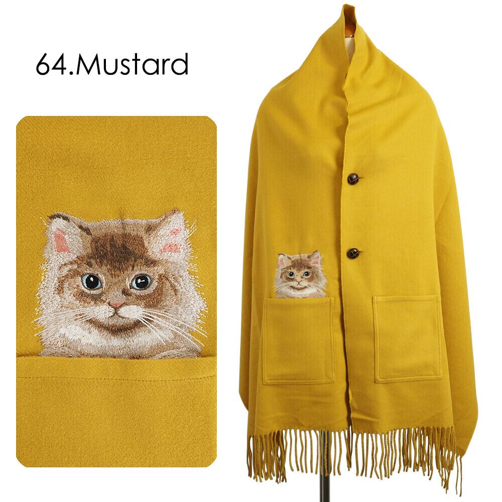 ラスト❶ ポッケに入った刺繍猫さんがカワイイ♡ ボタン&ポケット付 ポンチョ ストール 猫 ネコ 母の日 マスタード イエロー